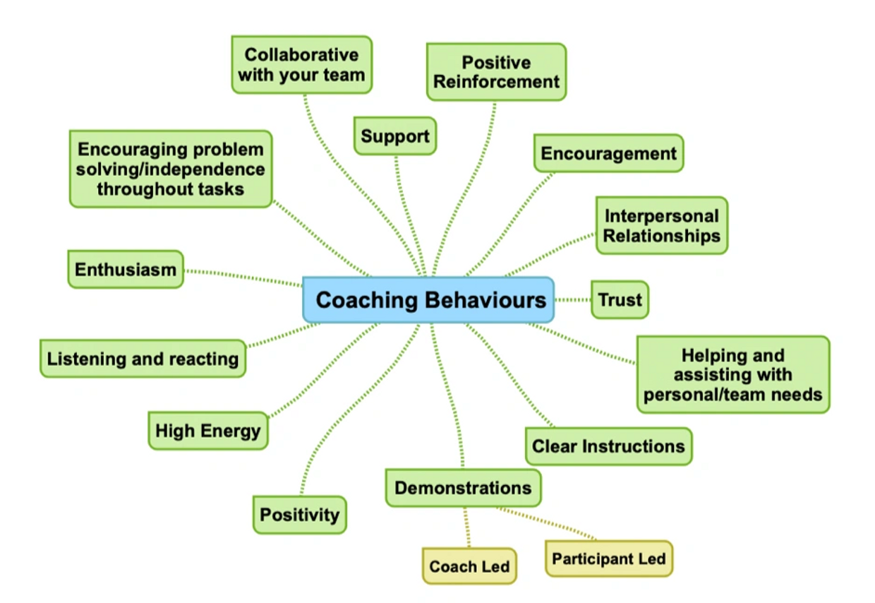 What are coaching behaviours? Coaching behaviours is what our participants see and pick up on, a coaches every day behaviour has an impact on our participants training and performance. Our behaviours can be tailored specifically to the age and stage of development for our participants age and stage of development. This spider diagram was created specifically for university hockey participants. When planning our sessions we can 'pre-plan' the different behaviours to use which will act as more support when coaching.