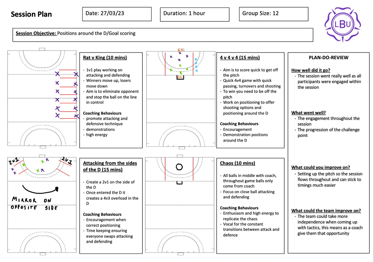 This is an example of a completed session plan focussing on positions around the D/Goal scoring. This shows you as a coach how you can split up each section utilising all the areas when planning and reviewing your sessions