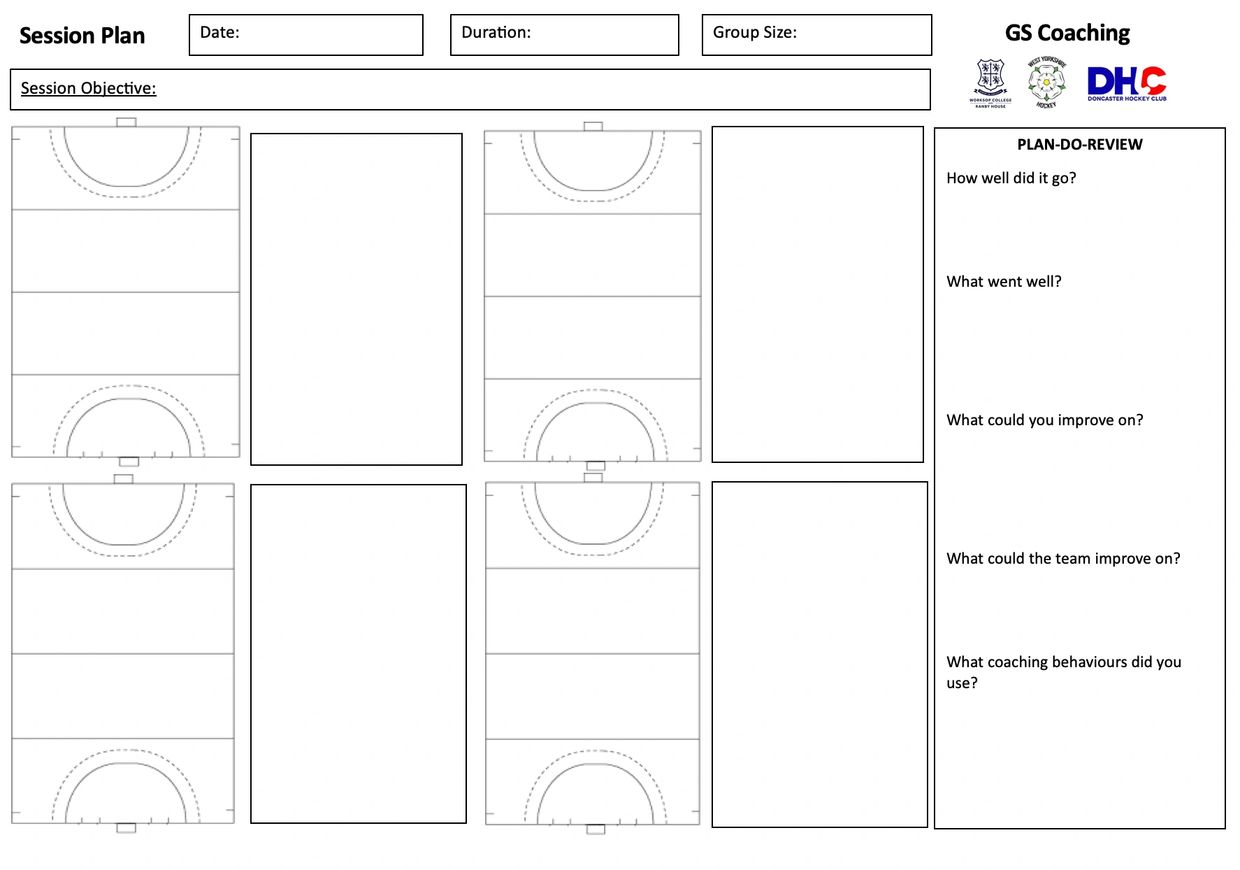 This session plan template was created to allow coaches to have a visual aid to take with them when coaching. It allows for a coach to draw out their different drills, with space to describe the aims of the drills and possible adaptions. This session plan also allows for a section on reviewing our coaching after a session which is key to learning and developing our practice.