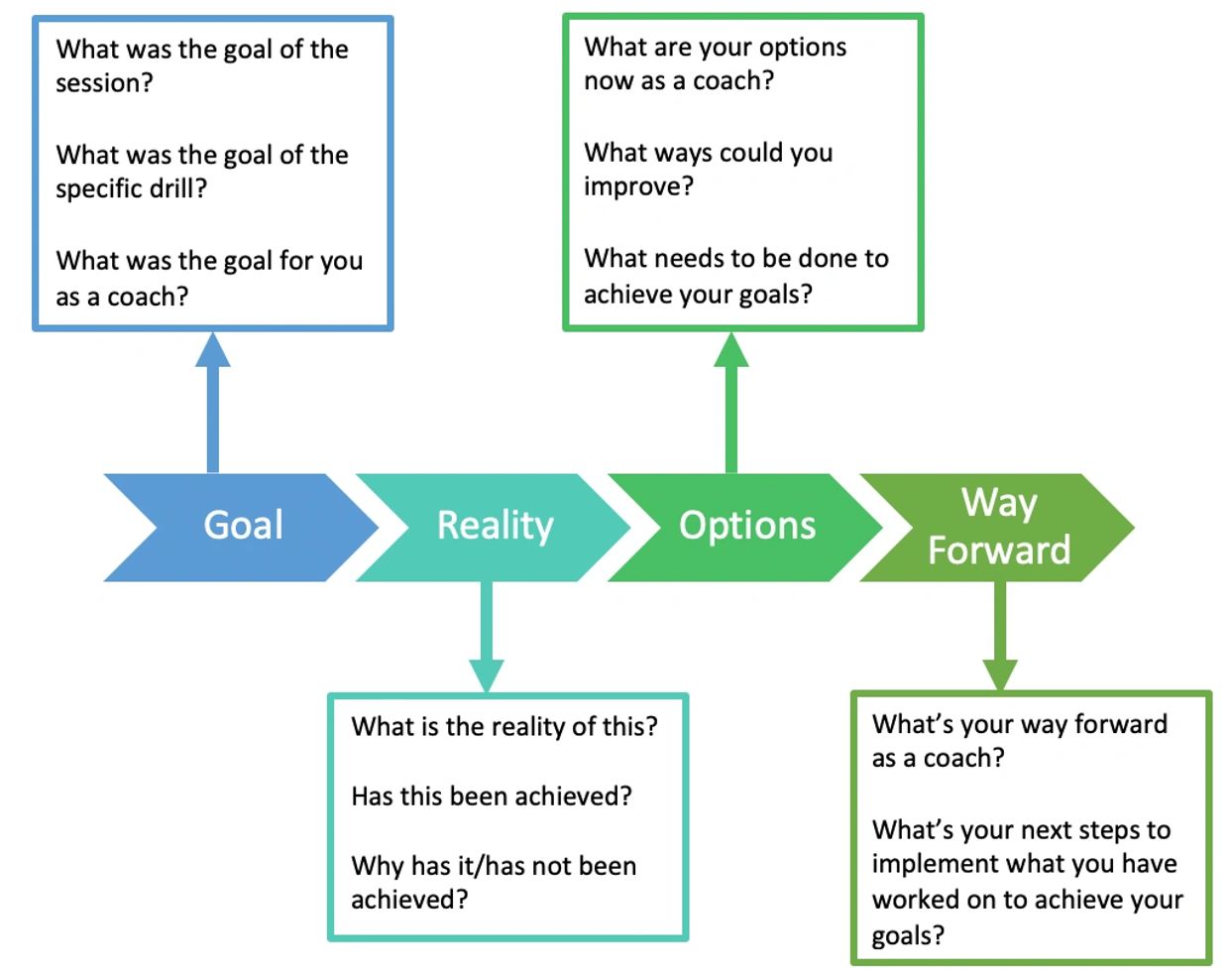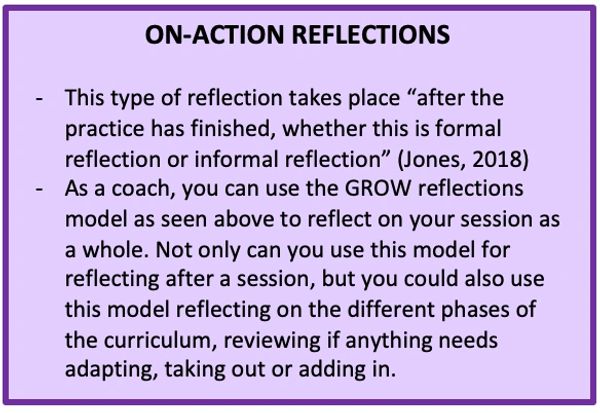 GROW reflections. By using GROW reflections we can break down our coaching long-term, medium-term or short-term with these reflective techniques. As a coach, its vital to be your biggest critique to develop your practice, it allows you to understand what went well, what we could improve on and how we can achieve this. Not only does it allow you to develop as a coach, but it also supports the development of your team as you can carefully evaluate every session, ensuring you meet the challenge point and the session objective of every session.